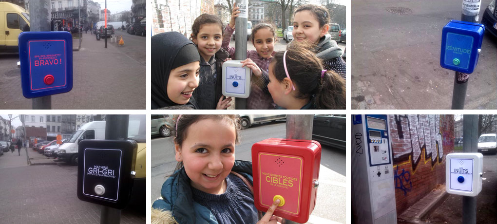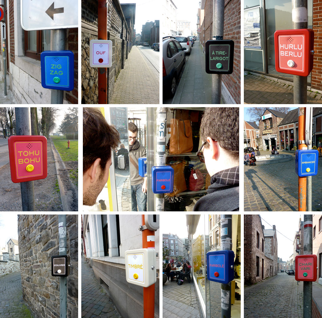 Les extraits sonores contenus dans les bornes ont été réalisés avec différents groupes Bruxellois lors d'ateliers d'écriture expérimentale.